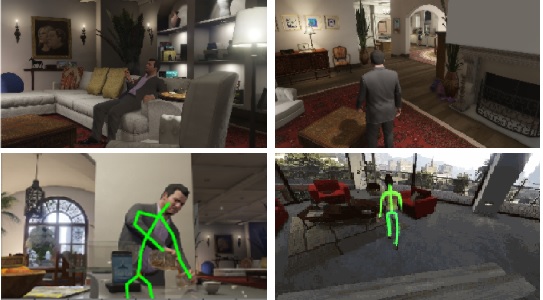 Simulation of human motion within indoor scenes based on both mocap datasets as well as photo-realistic game engines.