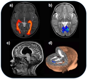 a) Probabilistic tractography reveals a structural pathway between the lateral geniculate nucleus of the thalamus and the visual cortex. b) Functional imaging reveals activation of the visual areas in the same healthy subject. c) Shows a unilateral lesion, and d) The analysis of the structural and functional connectivity reveals that both function and structure is disrupted in the hemisphere with the lesion.